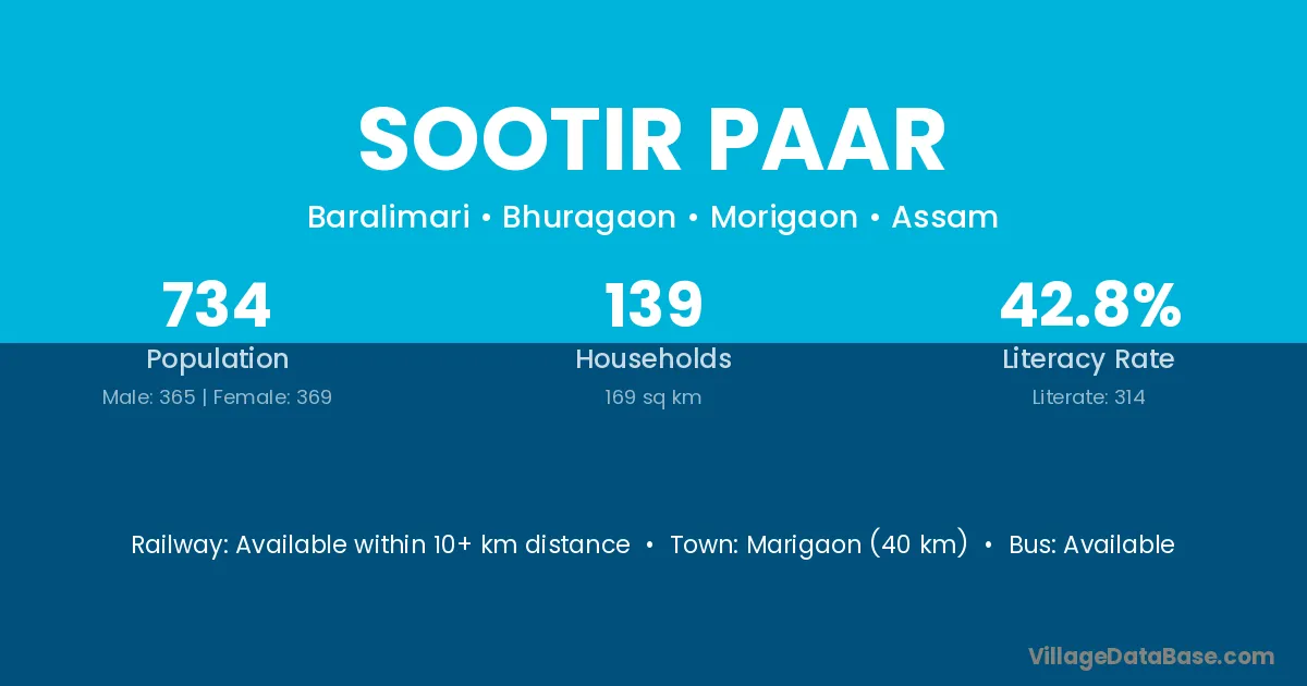 Marigaon (40 km) is the nearest town to Sootir Paar village for major economic activities and is located approximately 40 km away.