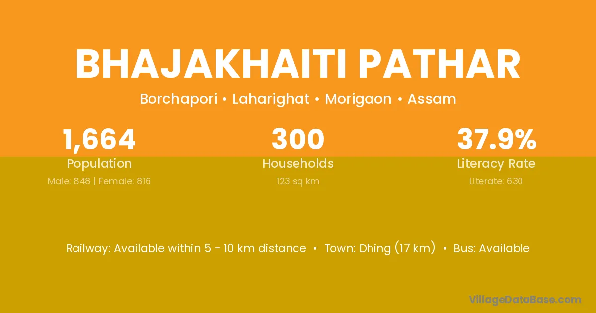 Dhing (17 km) is the nearest town to Bhajakhaiti Pathar village for major economic activities and is located approximately 17 km away.