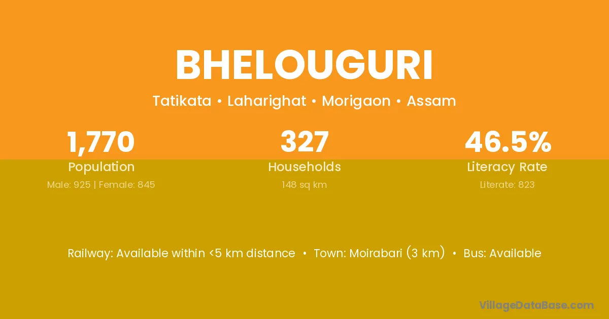 Moirabari (3 km) is the nearest town to Bhelouguri village for major economic activities and is located approximately 3 km away.