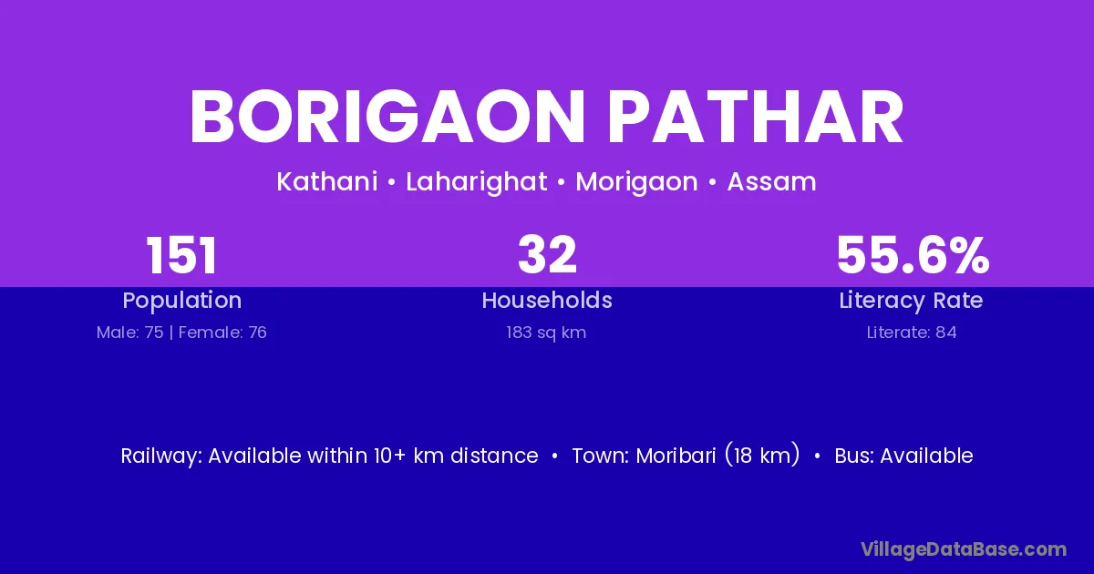 Moribari (18 km) is the nearest town to Borigaon Pathar village for major economic activities and is located approximately 18 km away.