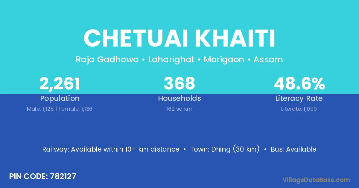 Dhing (30 km) is the nearest town to Chetuai Khaiti village for major economic activities and is located approximately 30 km away.