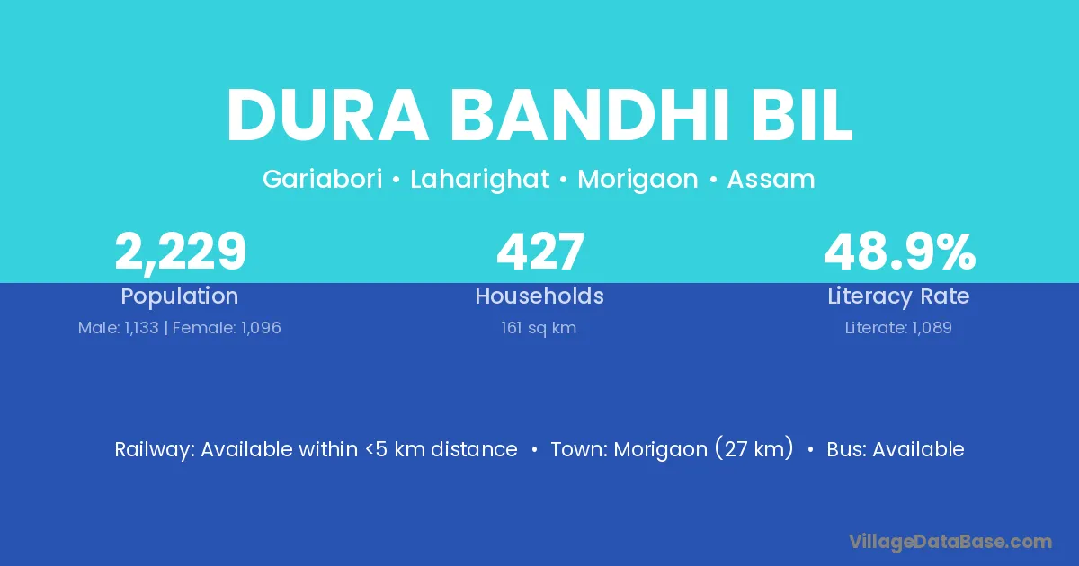 Morigaon (27 km) is the nearest town to Dura Bandhi Bil village for major economic activities and is located approximately 27 km away.