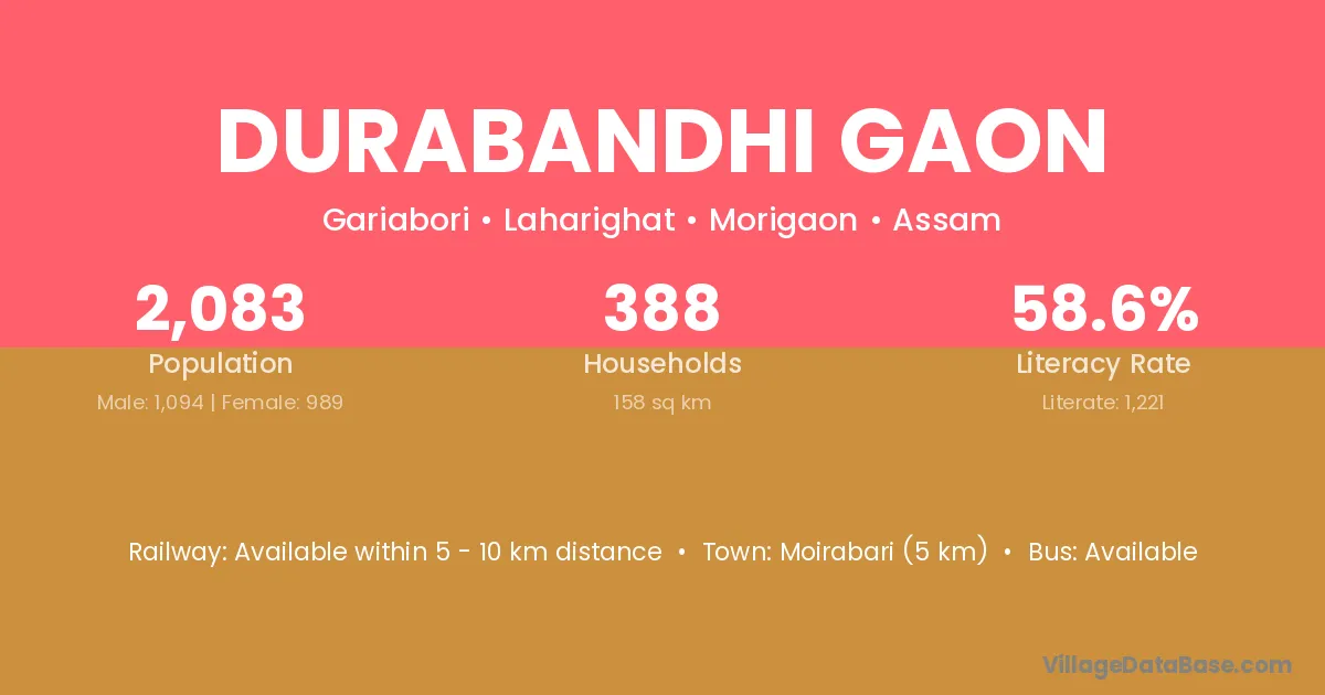 Moirabari (5 km) is the nearest town to Durabandhi Gaon village for major economic activities and is located approximately 5 km away.
