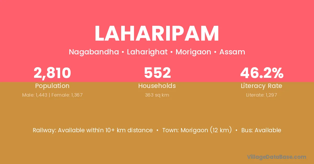 Morigaon (12 km) is the nearest town to Laharipam village for major economic activities and is located approximately 12 km away.