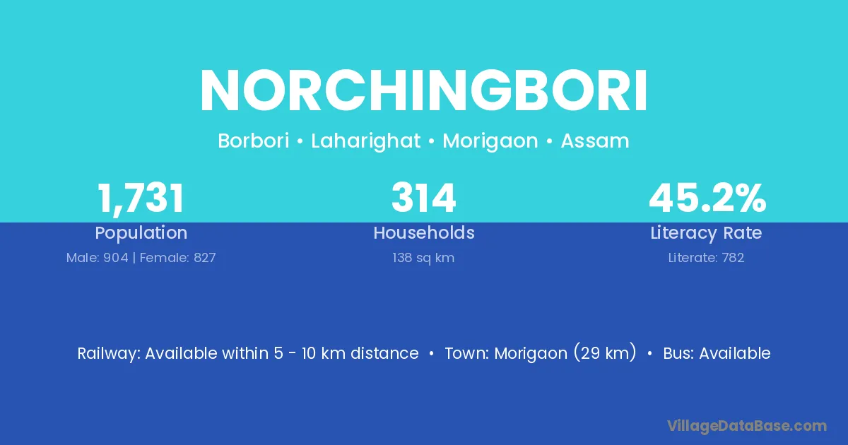 Morigaon (29 km) is the nearest town to Norchingbori village for major economic activities and is located approximately 29 km away.