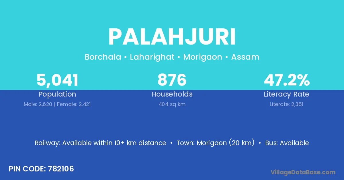 Morigaon (20 km) is the nearest town to Palahjuri village for major economic activities and is located approximately 20 km away.