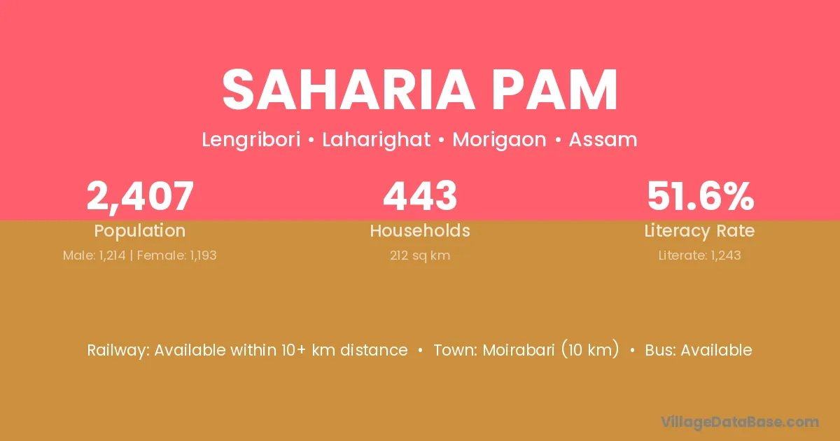 Moirabari (10 km) is the nearest town to Saharia Pam village for major economic activities and is located approximately 10 km away.