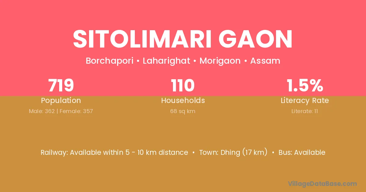 Sitolimari Gaon village has a total population of 719 people, of which 362 are males and 357 are females.