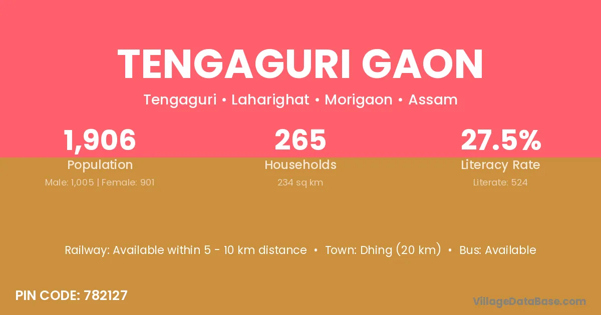 Dhing (20 km) is the nearest town to Tengaguri Gaon village for major economic activities and is located approximately 20 km away.