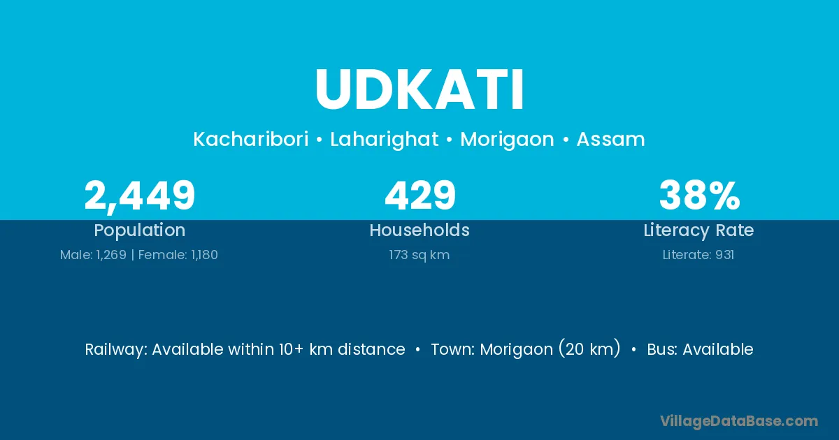Morigaon (20 km) is the nearest town to Udkati village for major economic activities and is located approximately 20 km away.