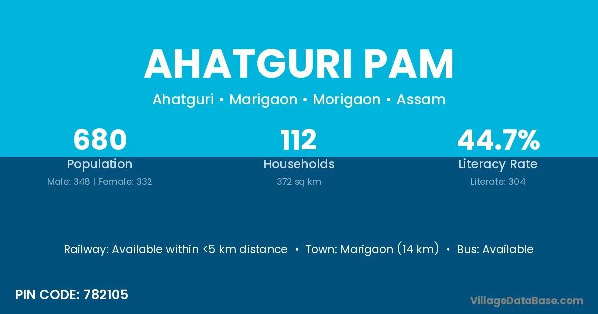 Marigaon (14 km) is the nearest town to Ahatguri Pam village for major economic activities and is located approximately 14 km away.