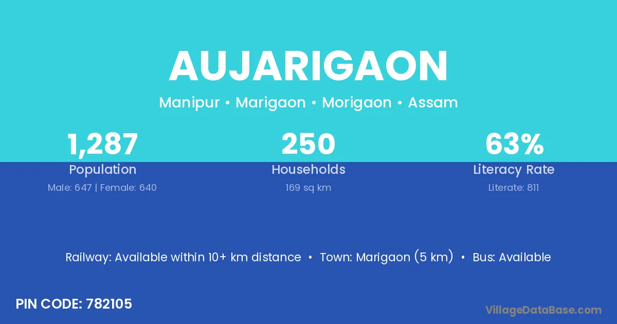 Marigaon (5 km) is the nearest town to Aujarigaon village for major economic activities and is located approximately 5 km away.