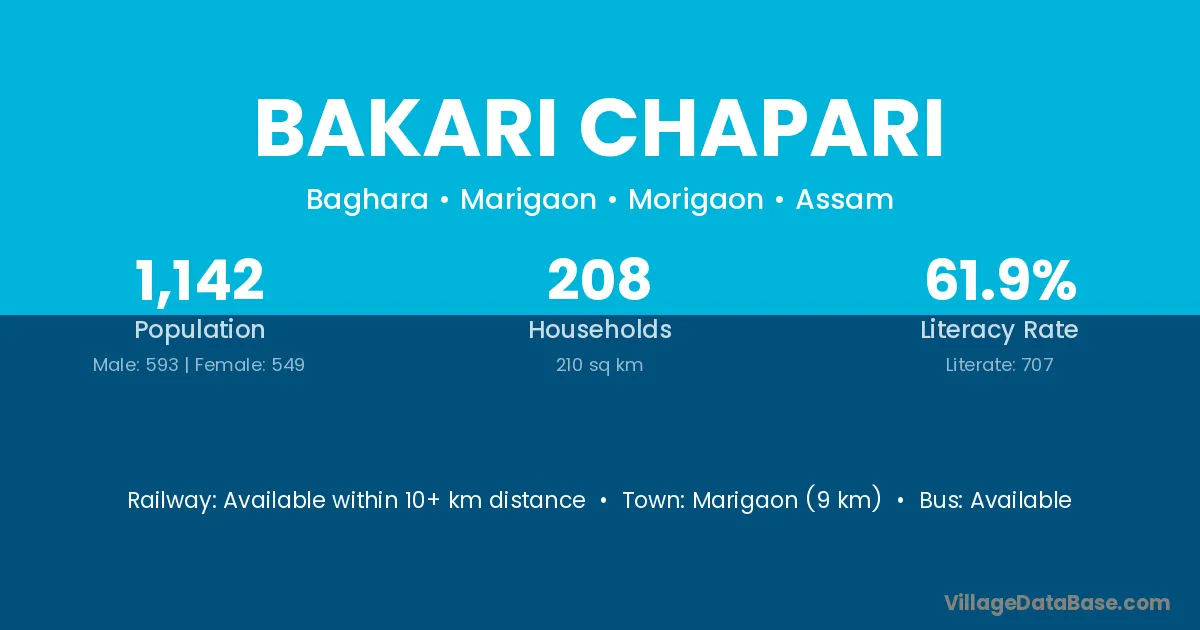 Marigaon (9 km) is the nearest town to Bakari Chapari village for major economic activities and is located approximately 9 km away.