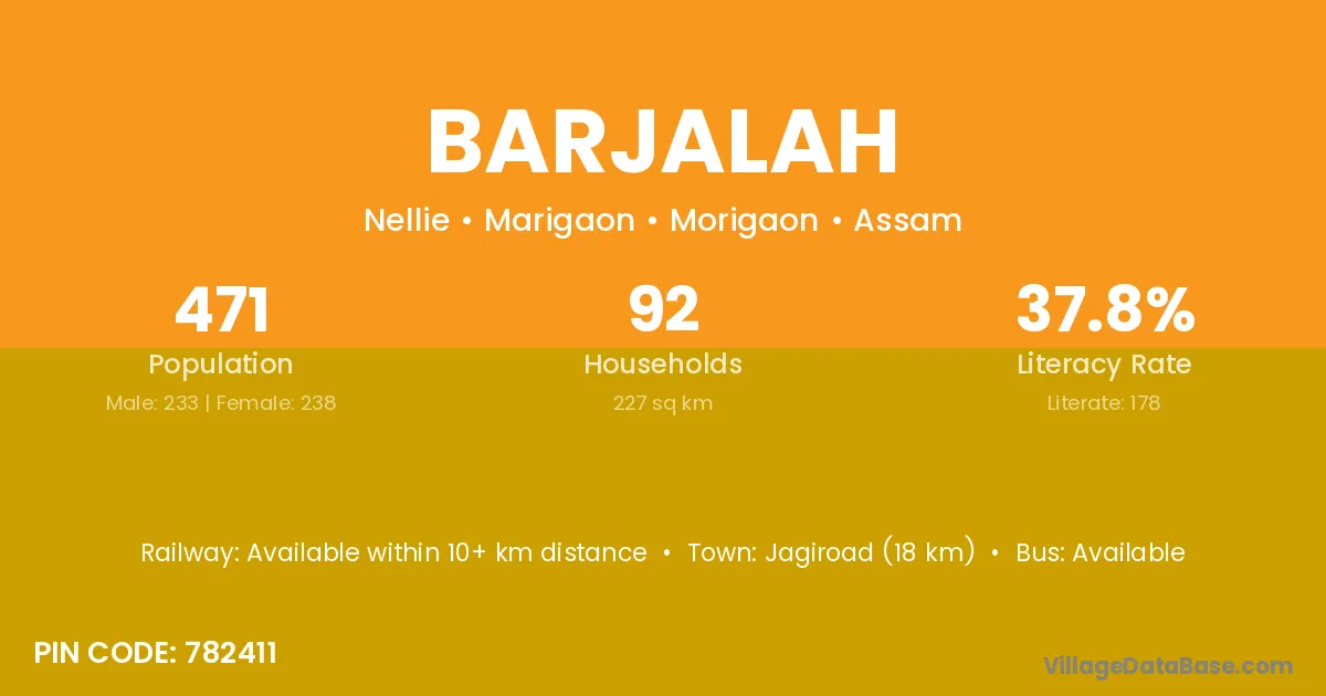 Jagiroad (18 km) is the nearest town to Barjalah village for major economic activities and is located approximately 18 km away.