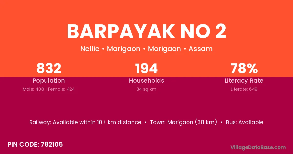 Marigaon (38 km) is the nearest town to Barpayak No 2 village for major economic activities and is located approximately 38 km away.