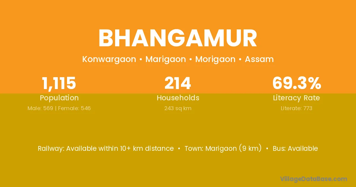 Marigaon (9 km) is the nearest town to Bhangamur village for major economic activities and is located approximately 9 km away.