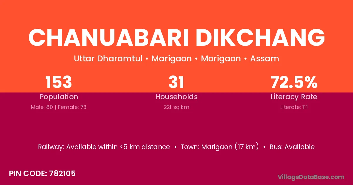 Chanuabari Dikchang village has a total population of 153 people, of which 80 are males and 73 are females.