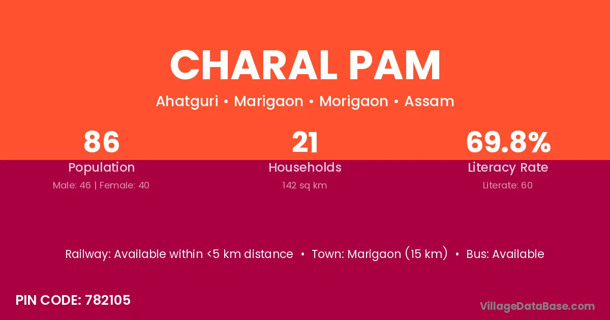 Marigaon (15 km) is the nearest town to Charal Pam village for major economic activities and is located approximately 15 km away.