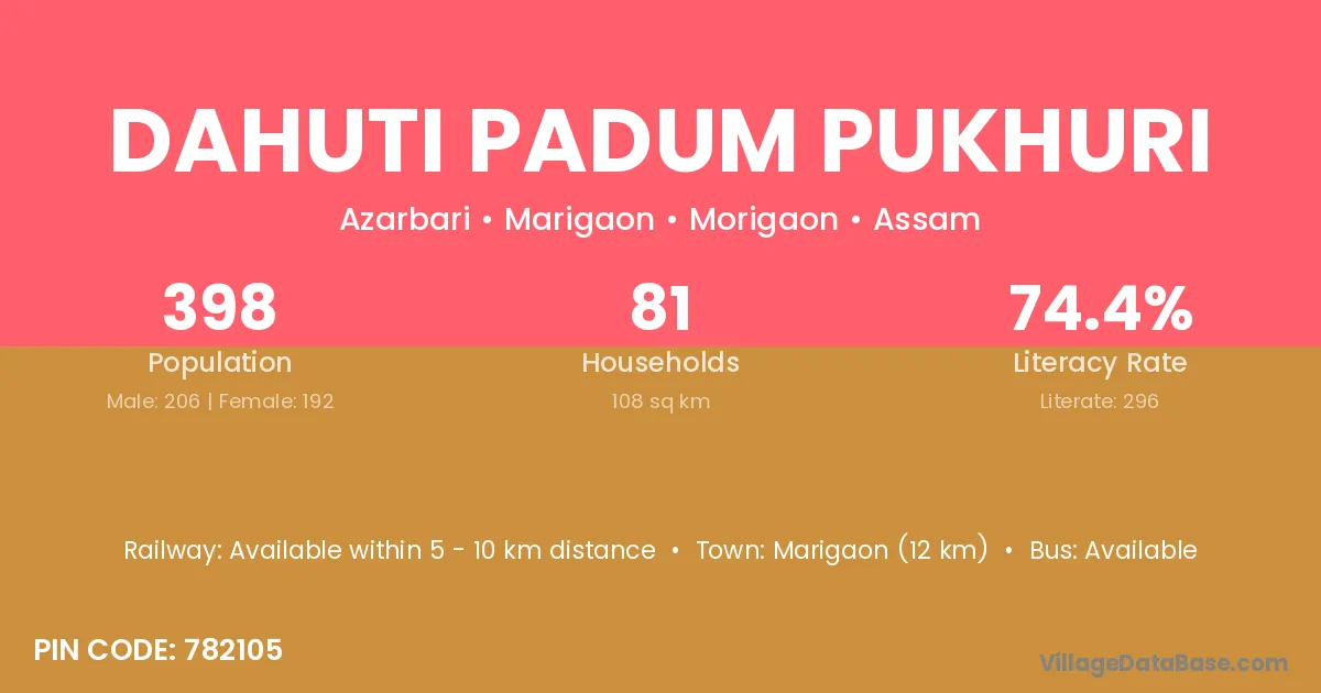 Dahuti Padum Pukhuri village has a total population of 398 people, of which 206 are males and 192 are females.