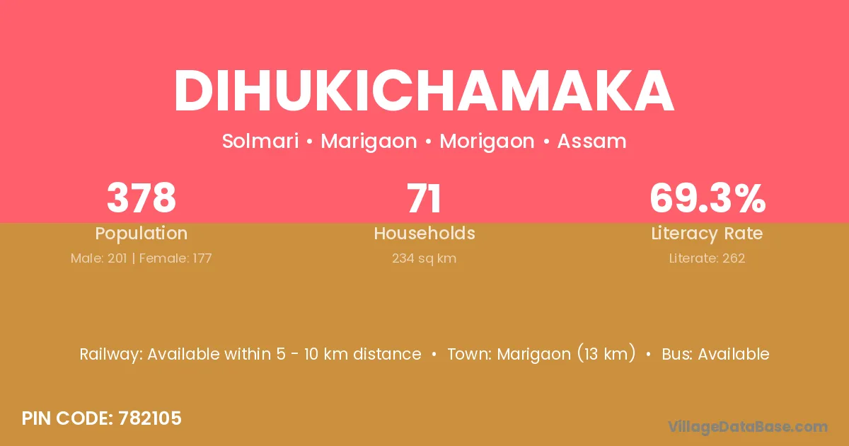 Marigaon (13 km) is the nearest town to Dihukichamaka village for major economic activities and is located approximately 13 km away.