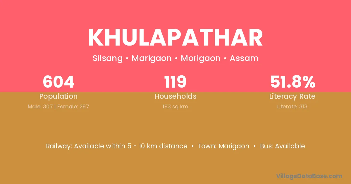 Khulapathar village has a total population of 604 people, of which 307 are males and 297 are females.