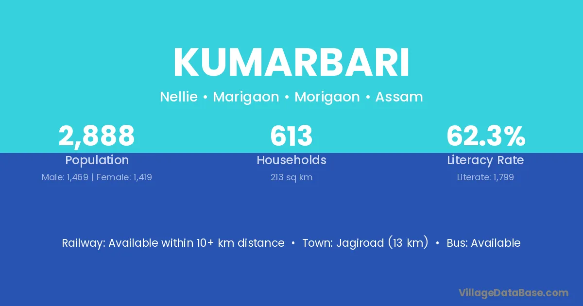 Jagiroad (13 km) is the nearest town to Kumarbari village for major economic activities and is located approximately 13 km away.