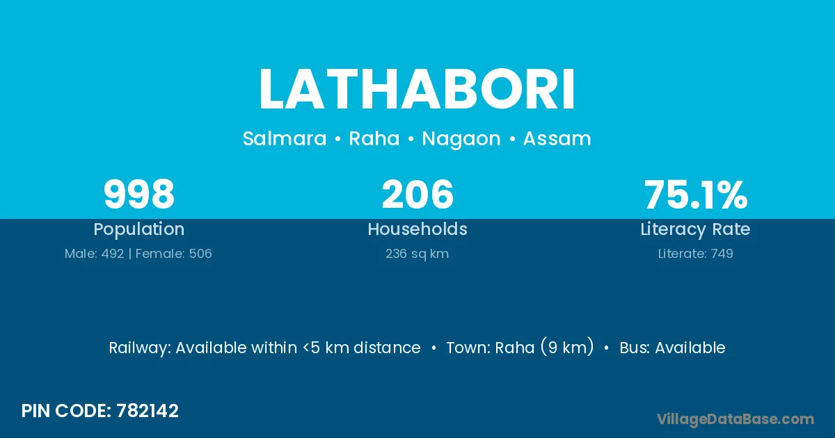 Marigaon (20 km) is the nearest town to Lathabori village for major economic activities and is located approximately 20 km away.
