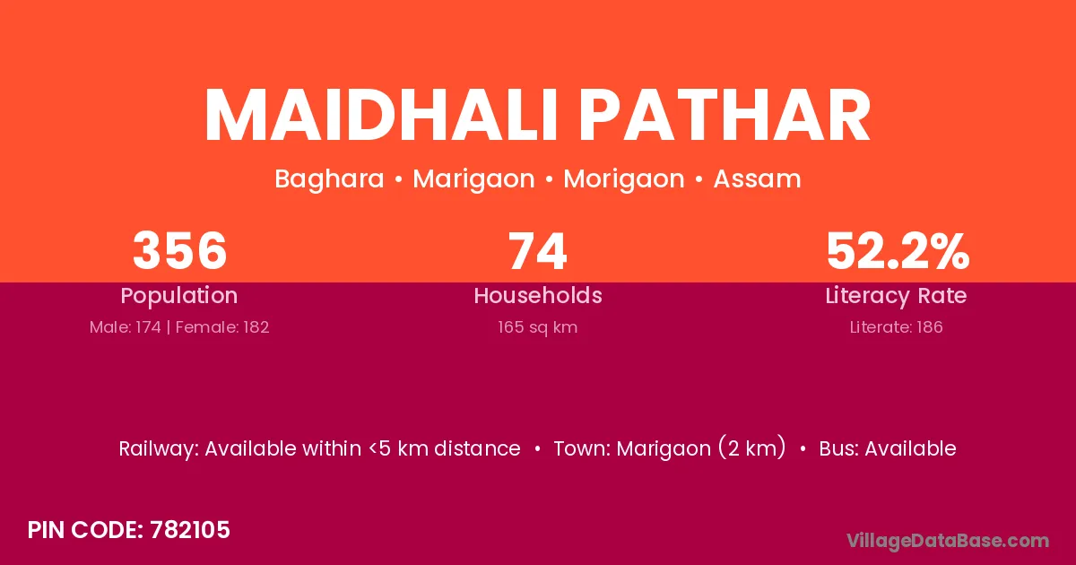 Marigaon (2 km) is the nearest town to Maidhali Pathar village for major economic activities and is located approximately 2 km away.
