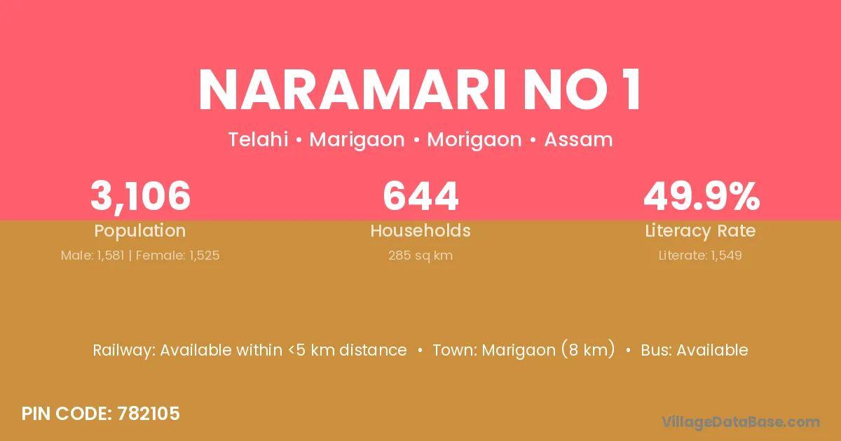 Marigaon (8 km) is the nearest town to Naramari No 1 village for major economic activities and is located approximately 8 km away.
