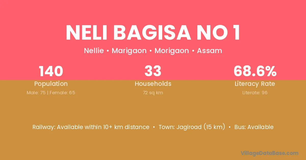 Jagiroad (15 km) is the nearest town to Neli Bagisa No 1 village for major economic activities and is located approximately 15 km away.