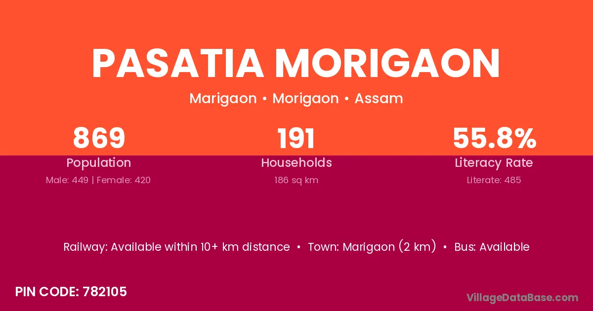 Pasatia Morigaon village has a total population of 869 people, of which 449 are males and 420 are females.