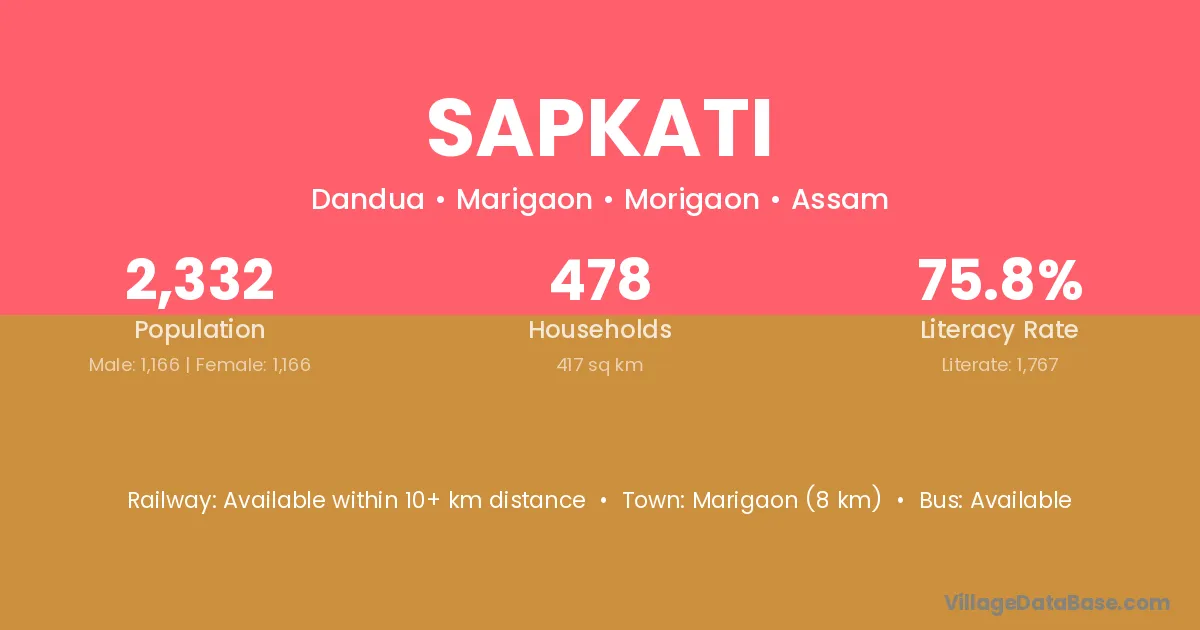 Marigaon (8 km) is the nearest town to Sapkati village for major economic activities and is located approximately 8 km away.