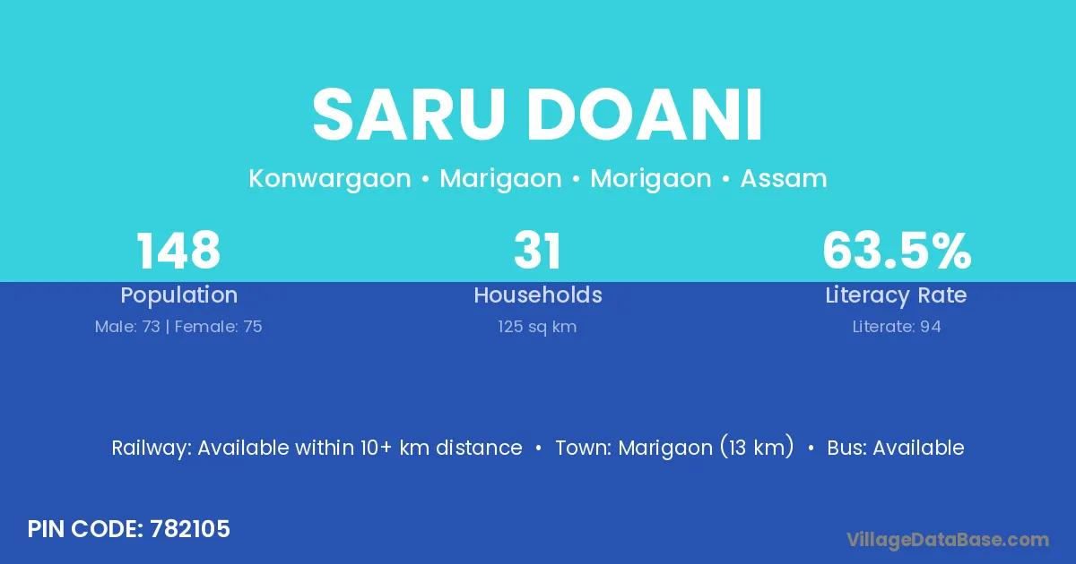 Marigaon (13 km) is the nearest town to Saru Doani village for major economic activities and is located approximately 13 km away.