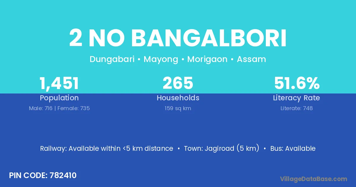 Jagiroad (5 km) is the nearest town to 2 No Bangalbori village for major economic activities and is located approximately 5 km away.