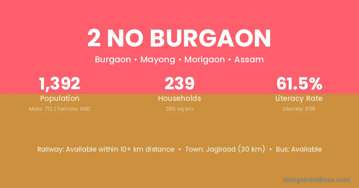 Jagiroad (30 km) is the nearest town to 2 No Burgaon village for major economic activities and is located approximately 30 km away.