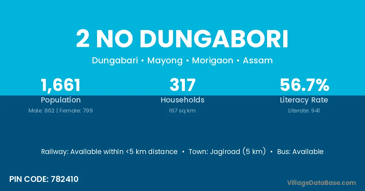 Jagiroad (5 km) is the nearest town to 2 No Dungabori village for major economic activities and is located approximately 5 km away.