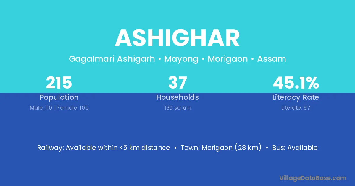 Morigaon (28 km) is the nearest town to Ashighar village for major economic activities and is located approximately 28 km away.
