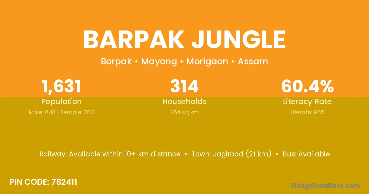 Jagiroad (21 km) is the nearest town to Barpak Jungle village for major economic activities and is located approximately 21 km away.