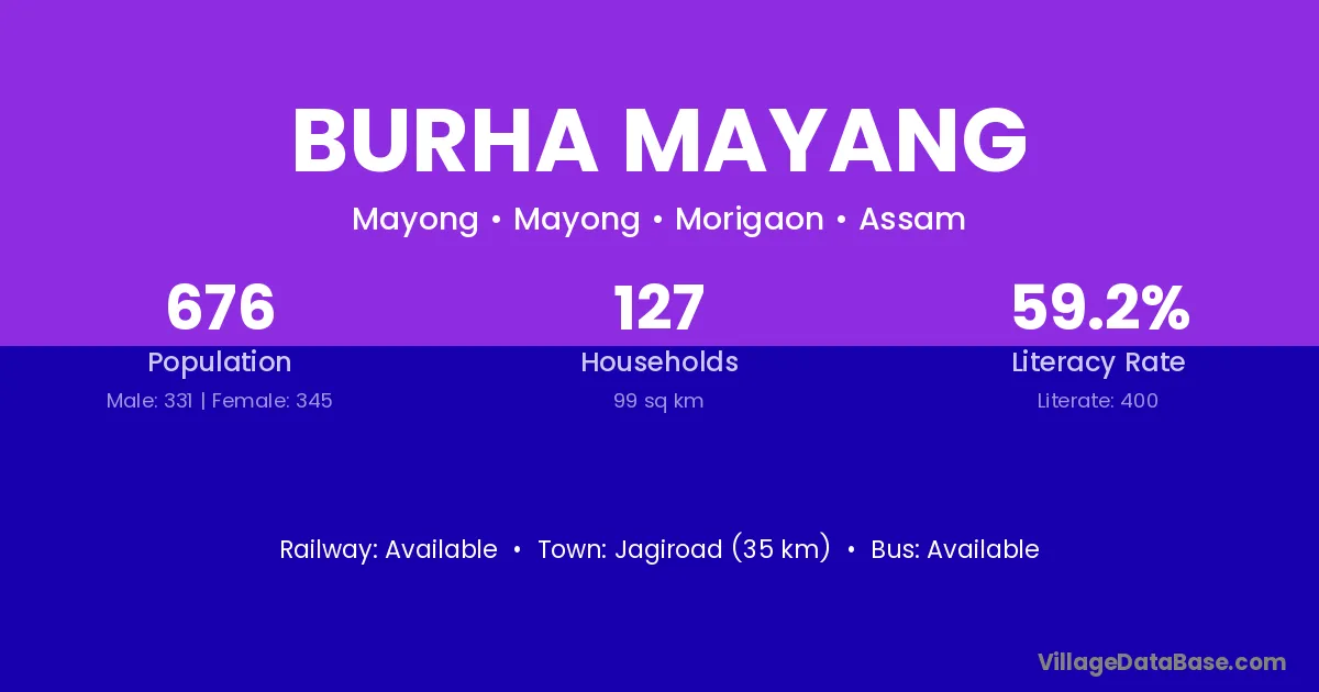 Burha Mayang village has a total population of 676 people, of which 331 are males and 345 are females.