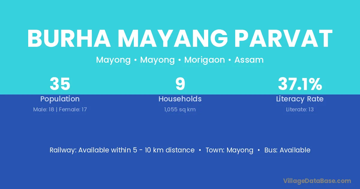 Burha Mayang Parvat village has a total population of 35 people, of which 18 are males and 17 are females.