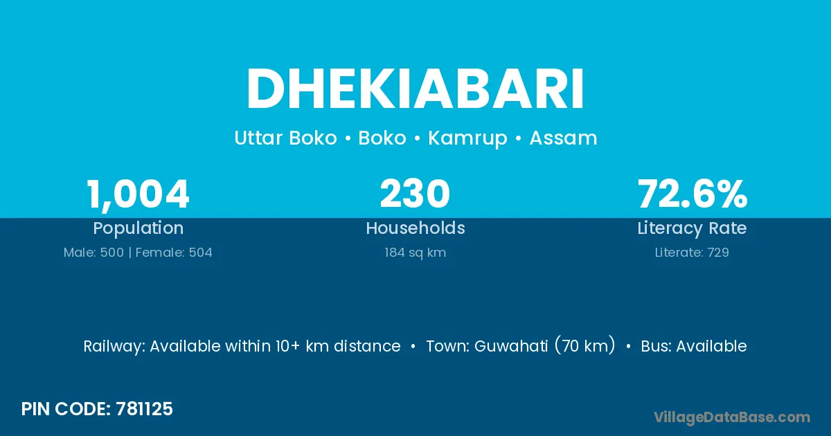 Guwahati (20 km) is the nearest town to Dhekiabari village for major economic activities and is located approximately 20 km away.