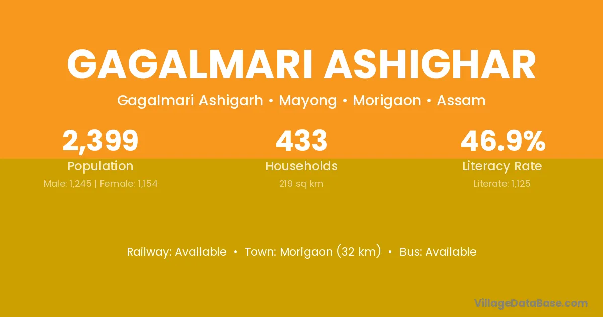 Morigaon (32 km) is the nearest town to Gagalmari Ashighar village for major economic activities and is located approximately 32 km away.