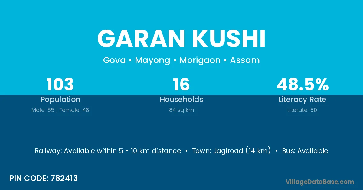 Jagiroad (14 km) is the nearest town to Garan Kushi village for major economic activities and is located approximately 14 km away.