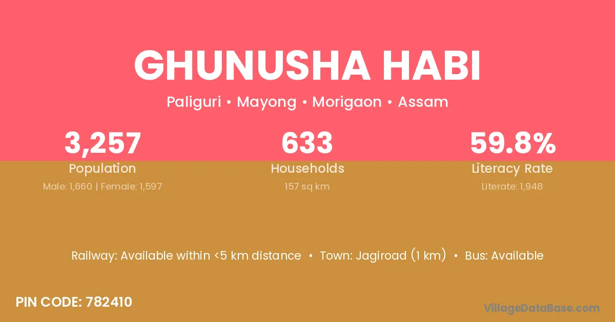 Jagiroad (1 km) is the nearest town to Ghunusha Habi village for major economic activities and is located approximately 1 km away.