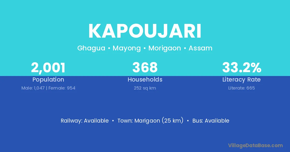 Marigaon (25 km) is the nearest town to Kapoujari village for major economic activities and is located approximately 25 km away.