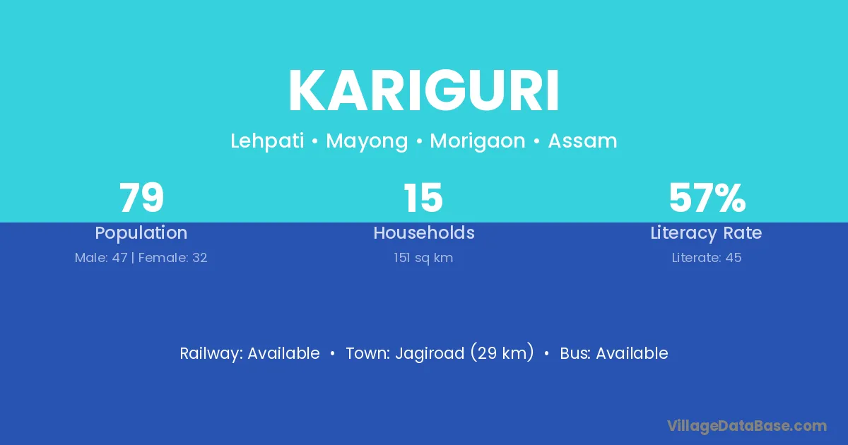 Jagiroad (29 km) is the nearest town to Kariguri village for major economic activities and is located approximately 29 km away.