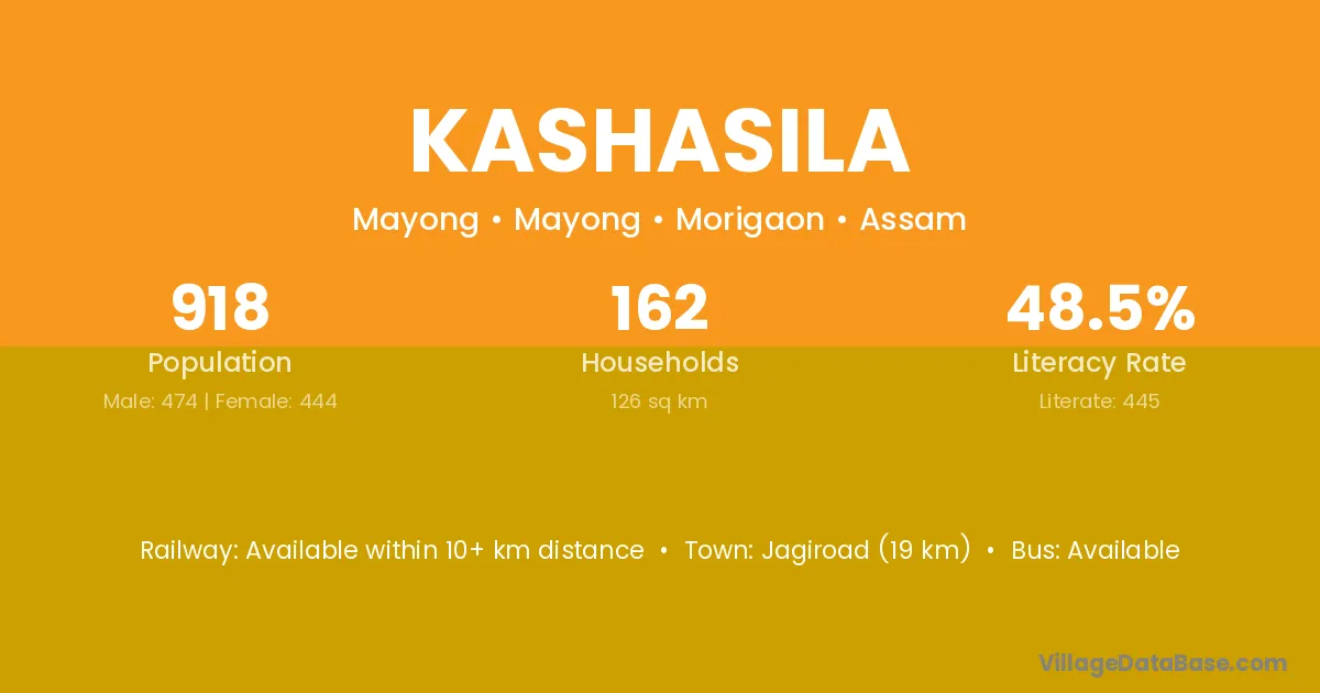 Jagiroad (19 km) is the nearest town to Kashasila village for major economic activities and is located approximately 19 km away.