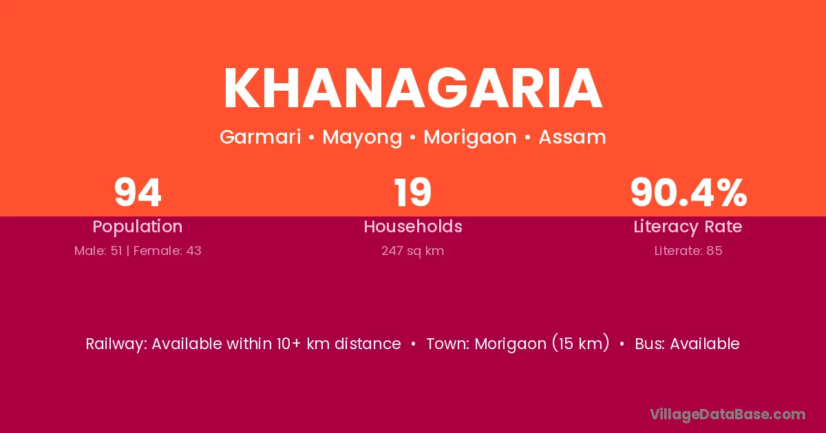Morigaon (15 km) is the nearest town to Khanagaria village for major economic activities and is located approximately 15 km away.
