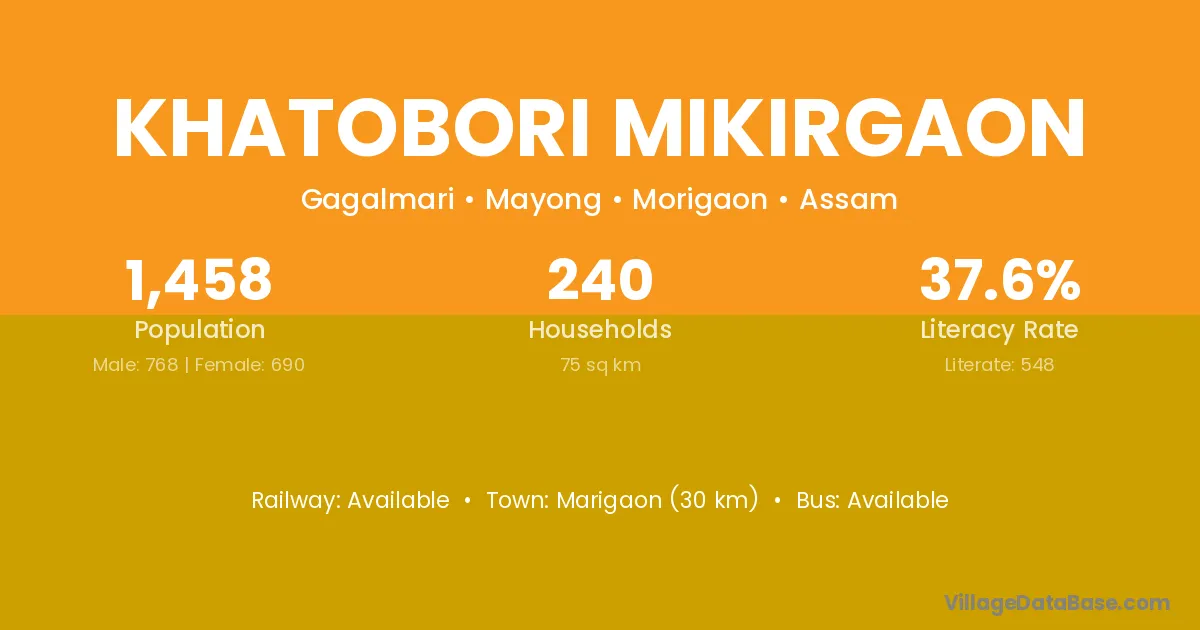 Khatobori Mikirgaon village has a total population of 1,458 people, of which 768 are males and 690 are females.