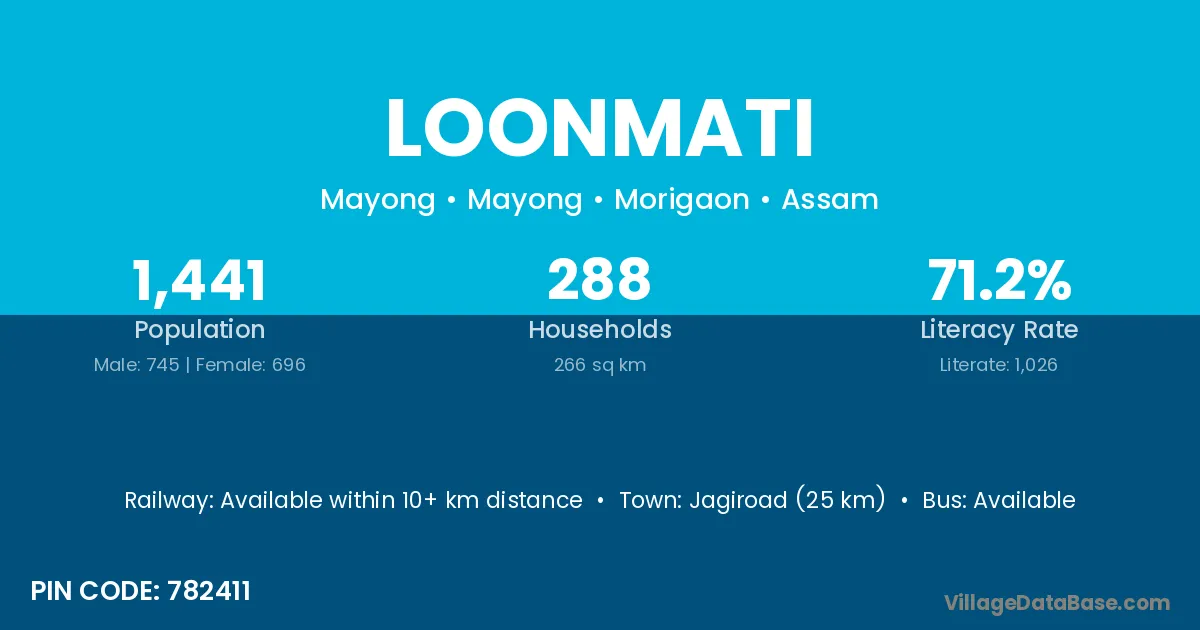 Jagiroad (25 km) is the nearest town to Loonmati village for major economic activities and is located approximately 25 km away.